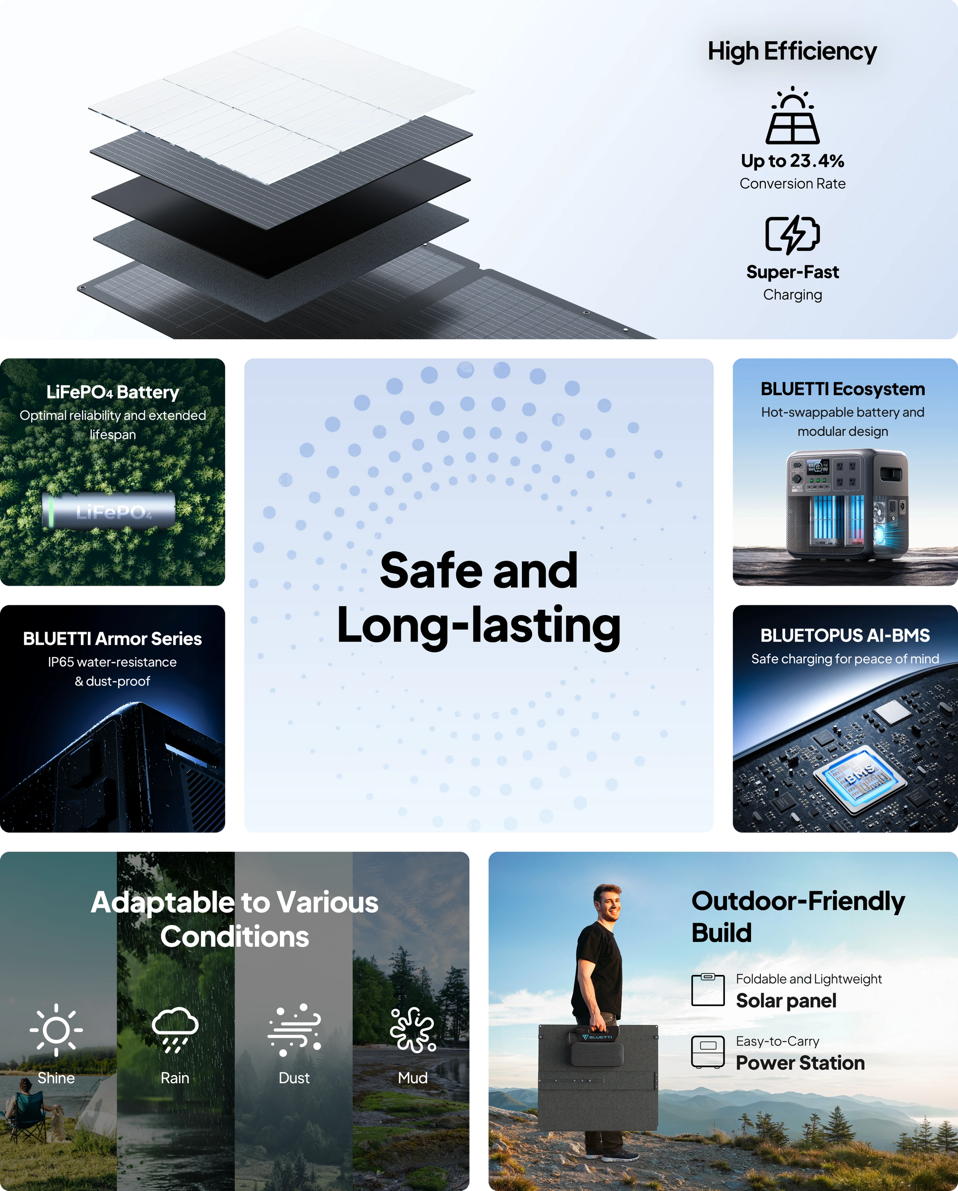 Get rid of fossil-fueled generators that produce toxic emissions and annoying noise. Discover how BLUETTI solar generators transform the way you embrace the great outdoors and beyond. Charge your electronics, keep your refrigerator running, or light up your campsite—all with the sun's energy.