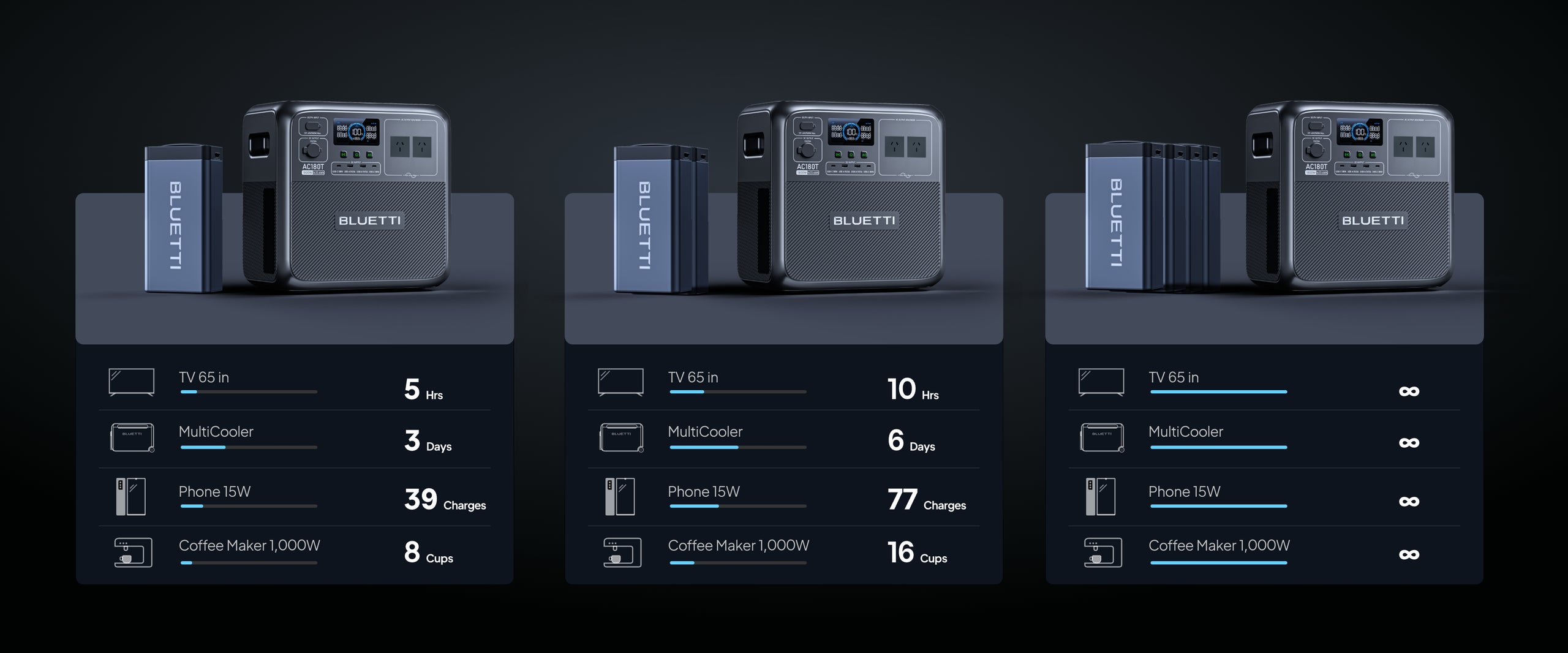 Both have the same output, but AC180T provides more capacity (1,433.6Wh vs. 1,152Wh). -