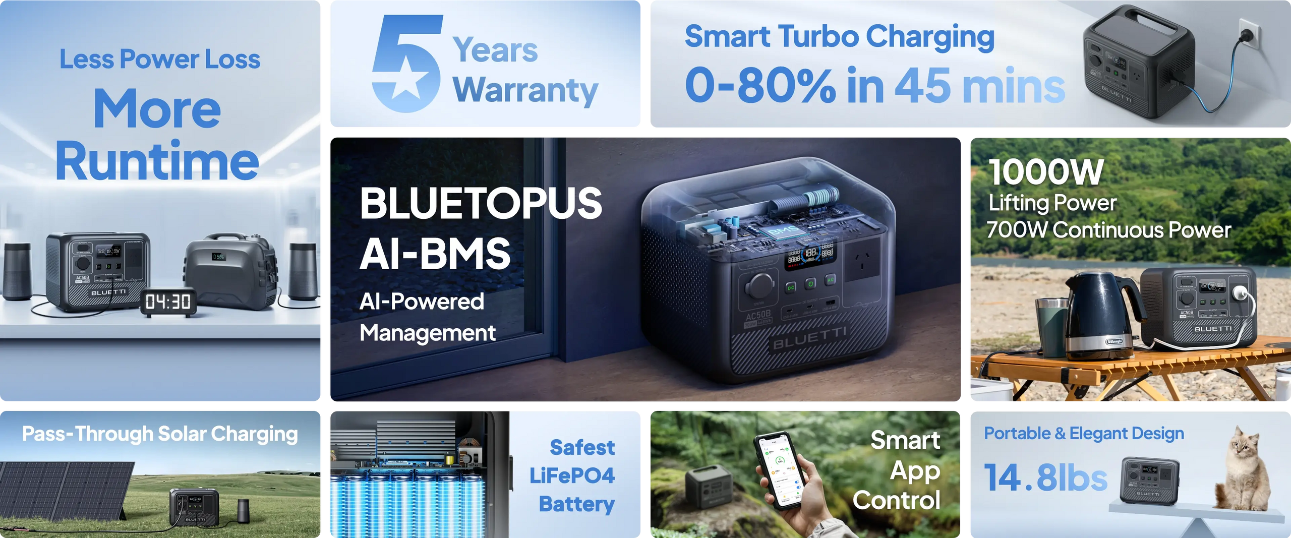 A:AC50B powers appliances up to 700W. The power lifting mode supports pure resistance devices like kettles and irons under 1,000W load capacity.