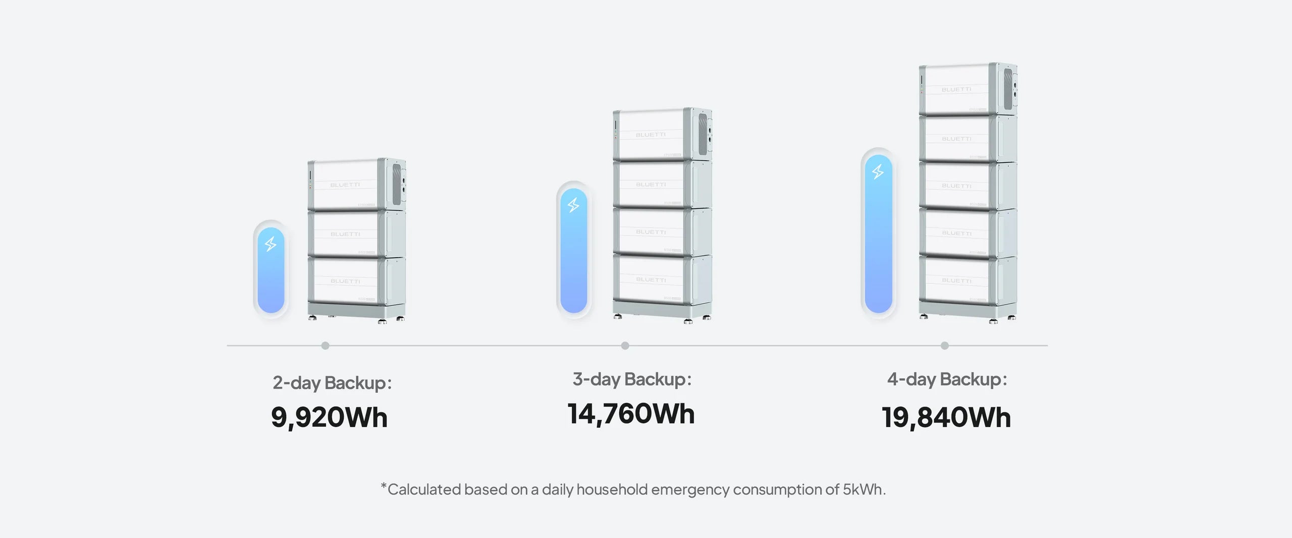 A:The recommended combo will be available just for your needs after you calculate your energy consumption with our handy calculator on BLUETTI's website under Home Energy > Design My System.