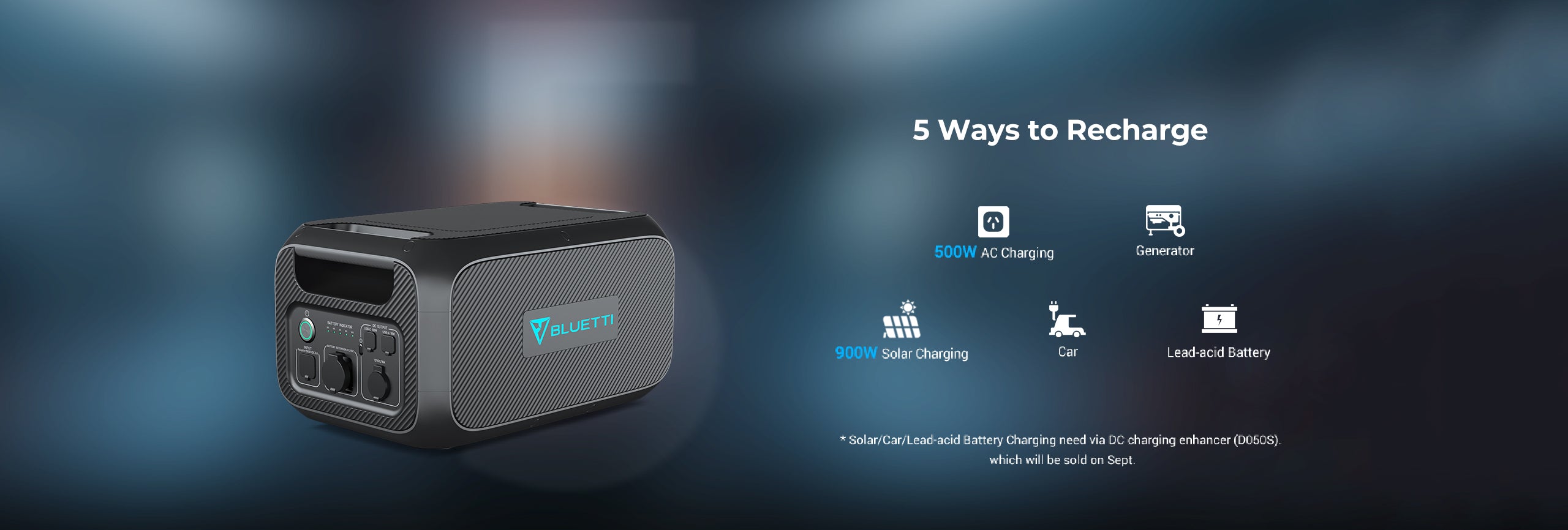 2. Car cigarette lighter output or solar panels(BLUETTI D050S DC charging enhancer is sold separately.)