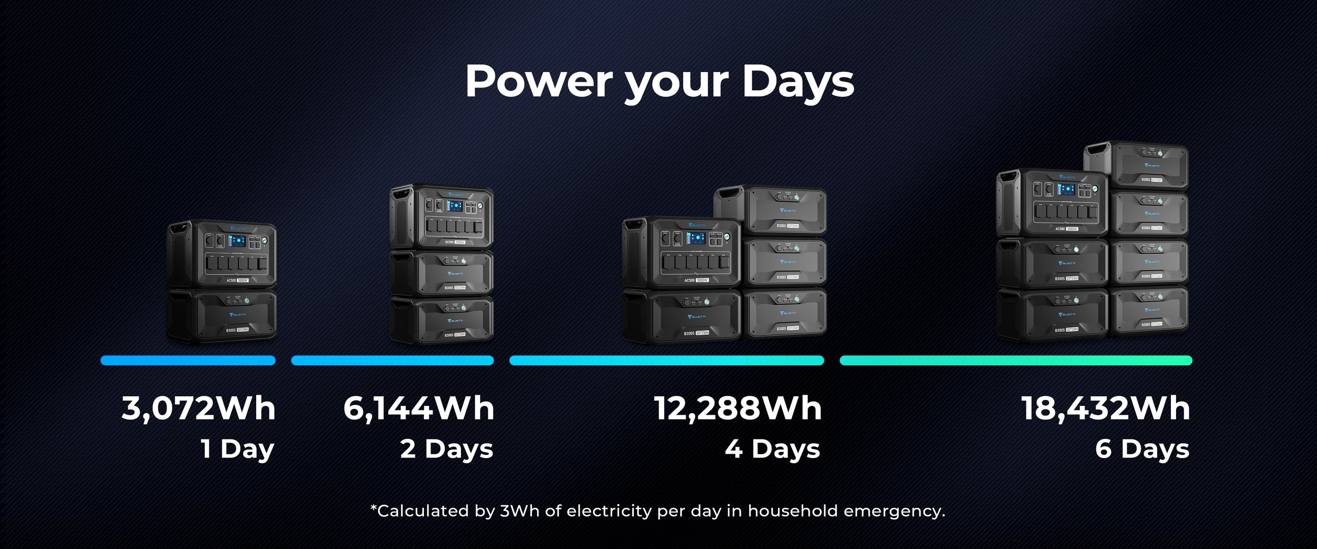 3072Wh(51.2V,60A)3×240V/10A,2×240V/15A,1×240V/32A,5000W In Total4500W Max.3000W Max.,12-150VDC,15ALiFePO₄3500+ CyclesBLUETTI App (WiFi/Bluetooth)20.5*12.8*14.1in / 52*32*35.80cm(AC500)66.2 lbs(30 kg)(AC500)