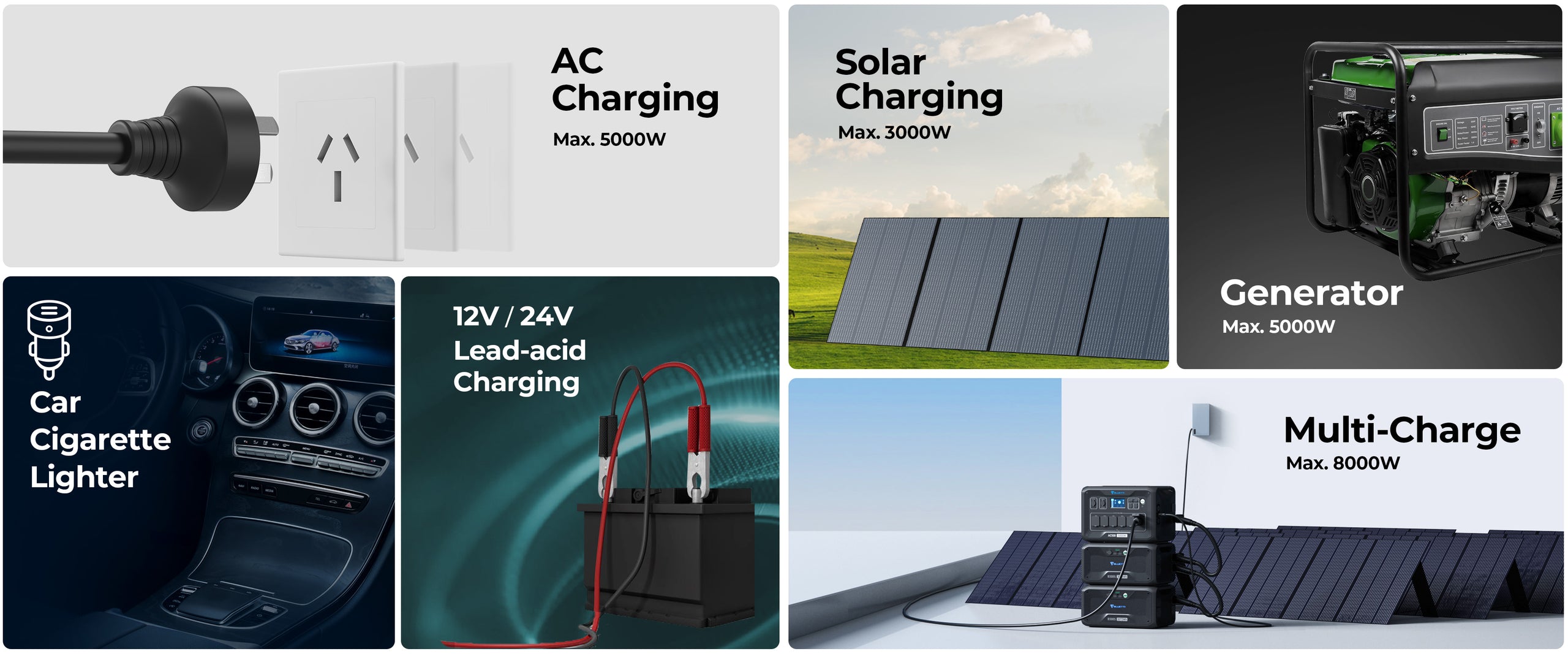 8,000W Max. with 2*B300S or more (Solar + AC). -