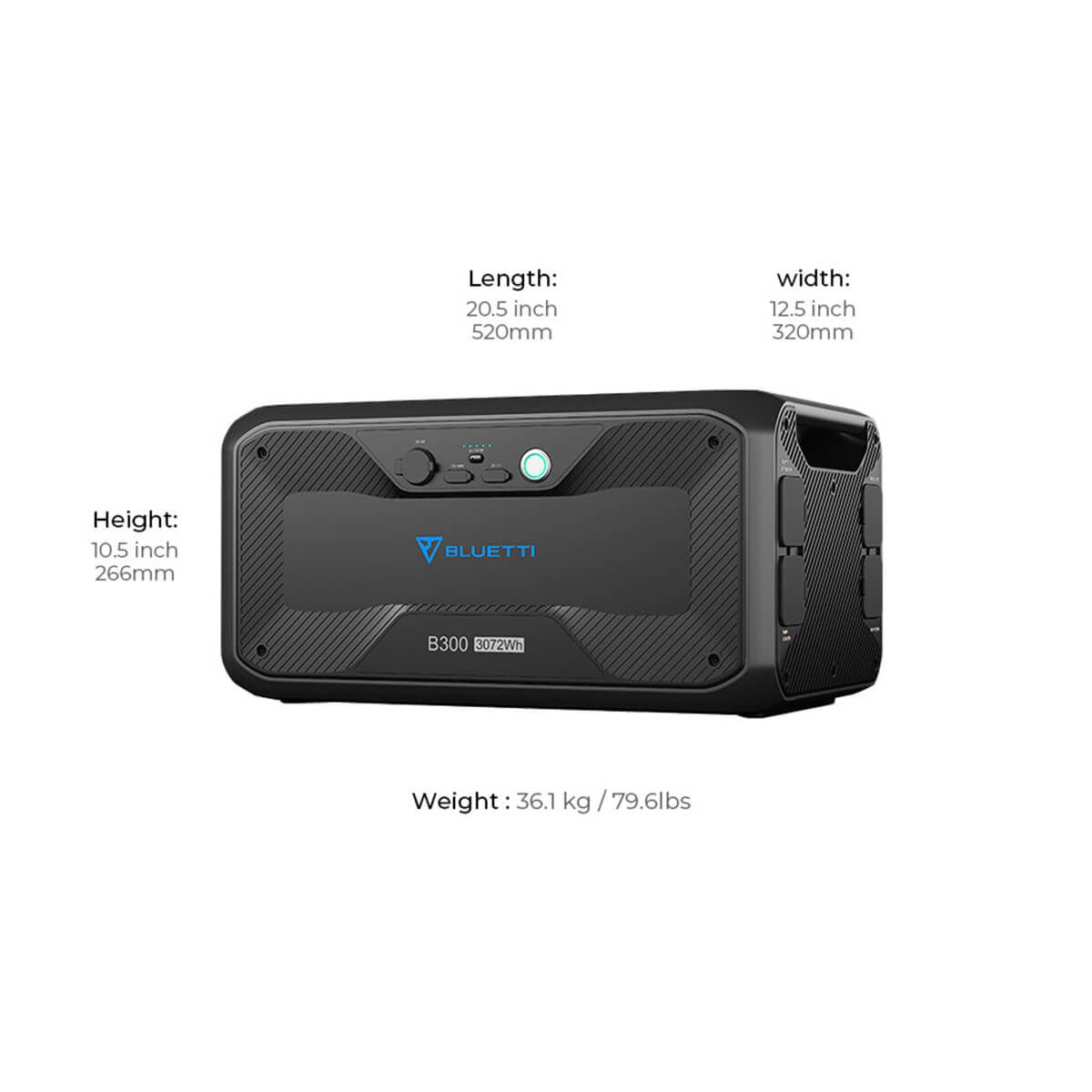 B300 has 3,072Wh capacity and over 3,500 life cycles with the LifePO4 battery cells, offering up to 80% of original capacity. Moreover, it will double, triple, even quadruple the total capacity with BLUETTI AC200MAX, AC200P, or AC300 series.