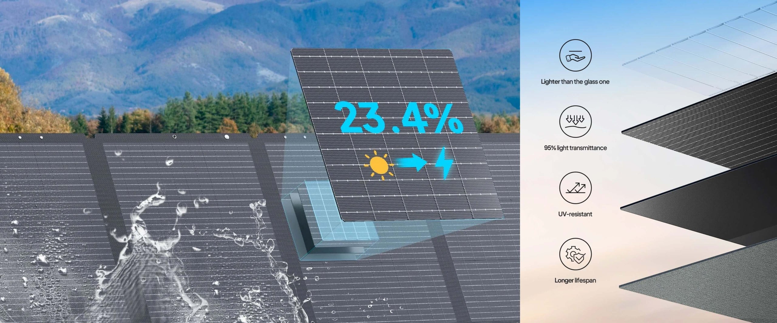 200WETFE (Ethylene tetrafluoroethylene)Up to 23.4%26.1V10.3AStandard MC4 ConnectorIP6589.2*23.2 in / 2,265*590mm23.2*24.8 in / 590*600 mm16.1 lbs (7.3 kg)