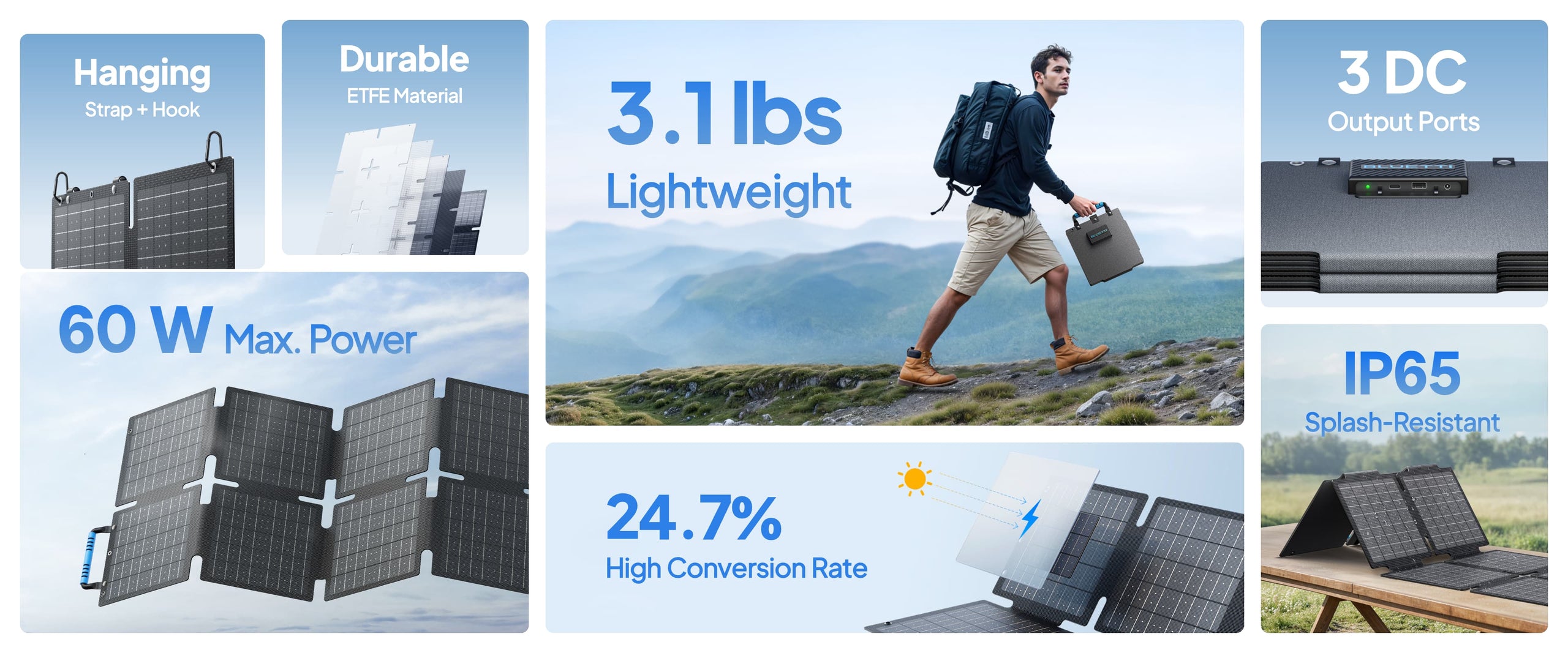 Designed to charge your devices efficiently while you're on the go, the PV60F is your perfect pal for outdoor adventures. With a lightweight build, durable ETFE material, and IP65 splash resistance, it ensures everlasting power supply through your journey.