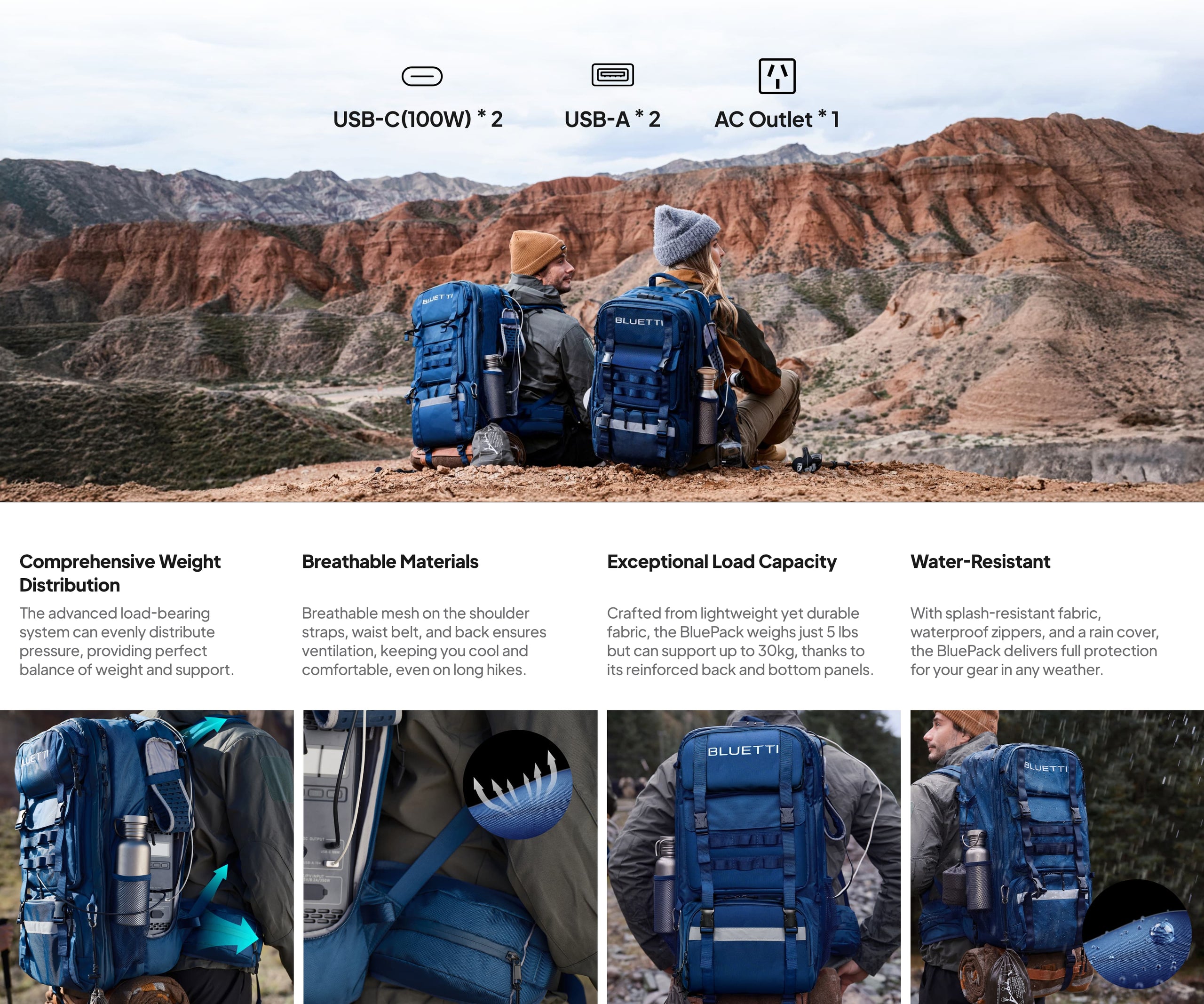 A: No, but the BluePack backpack is designed with comprehensive water resistance, featuring splash-resistant fabric, waterproof zippers, and a rain cover that can handle medium to heavy rain, ensuring protection in various outdoor conditions.