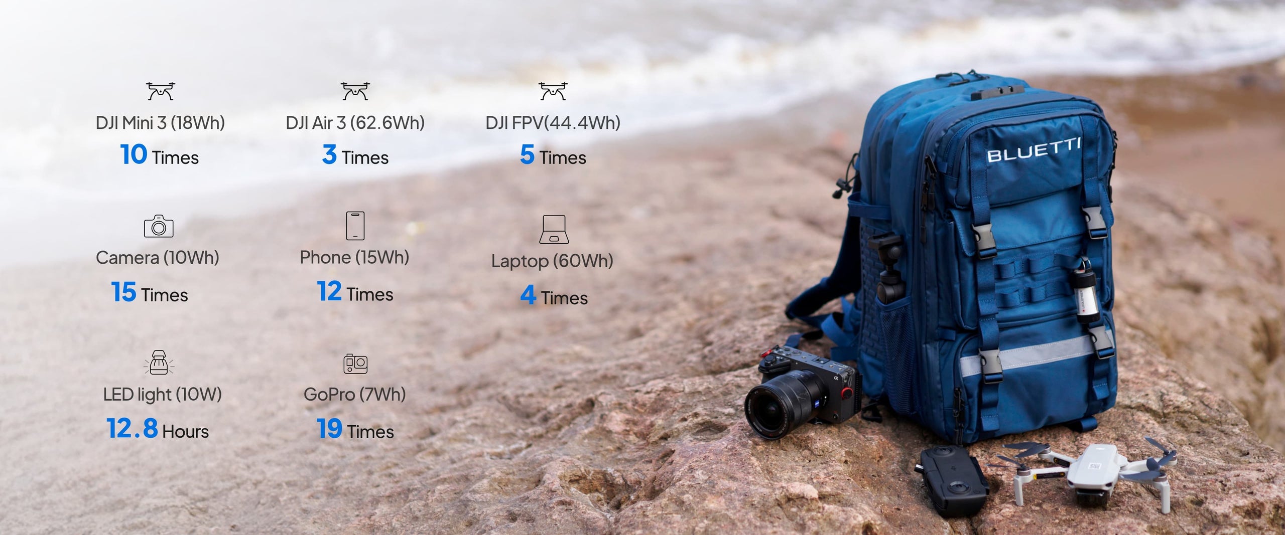 Charge up to 5 devices simultaneously, including your drone, controller, camera, smartphone, and laptop. With extended battery life, you can stay powered up and ready for action without the hassle of waiting in line.