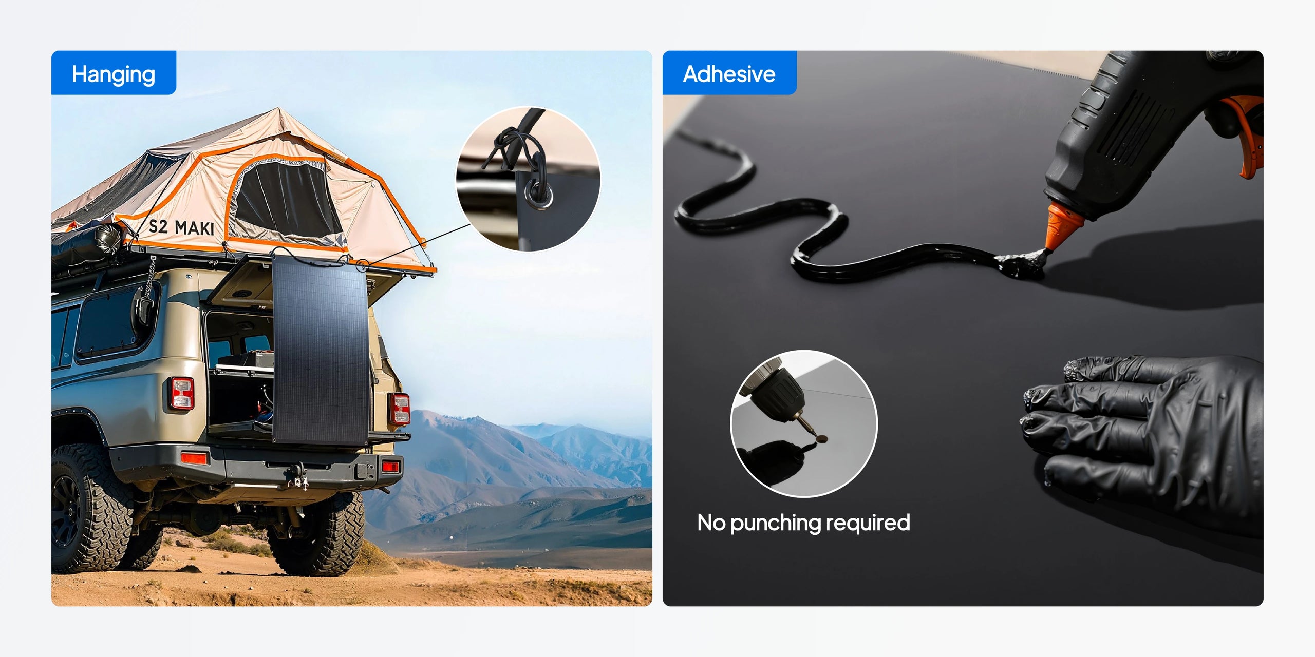 A:Use adhesive, straps, or ropes through the corner holes for a secure installation. For step-by-step instructions, watch the RVSolar Installation video on the BLUETTI Support YouTube channel.