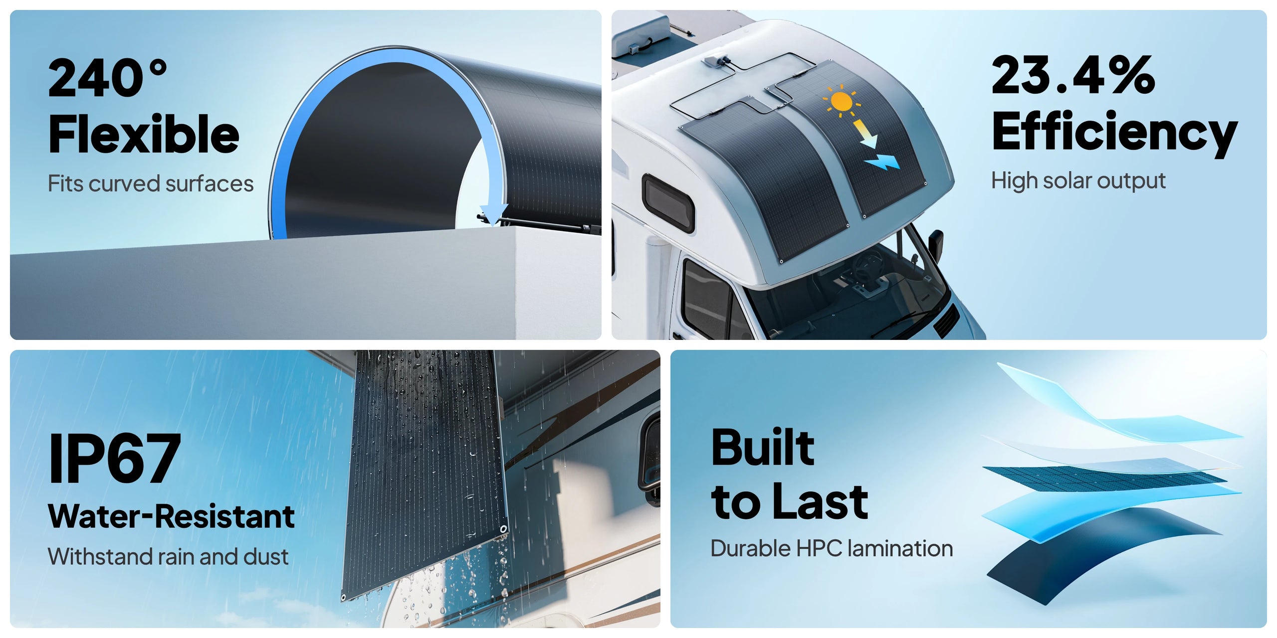 Flexible panels, like the PV100 FX, are easier to install and less prone to damage. -