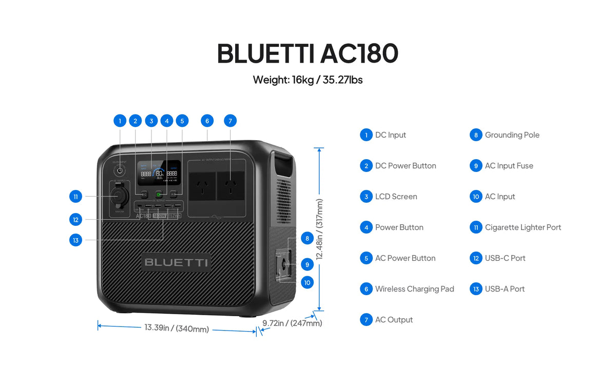 1440Wh(40V,36Ah)2×230V,1800W In Total1440W Max.500W Max.,12-60VDC,10ALiFePO₄3500+ CyclesBLUETTI App (Bluetooth)13.39*9.72*12.48 in / 340* 247*317mm35.27 lbs(16 kg)